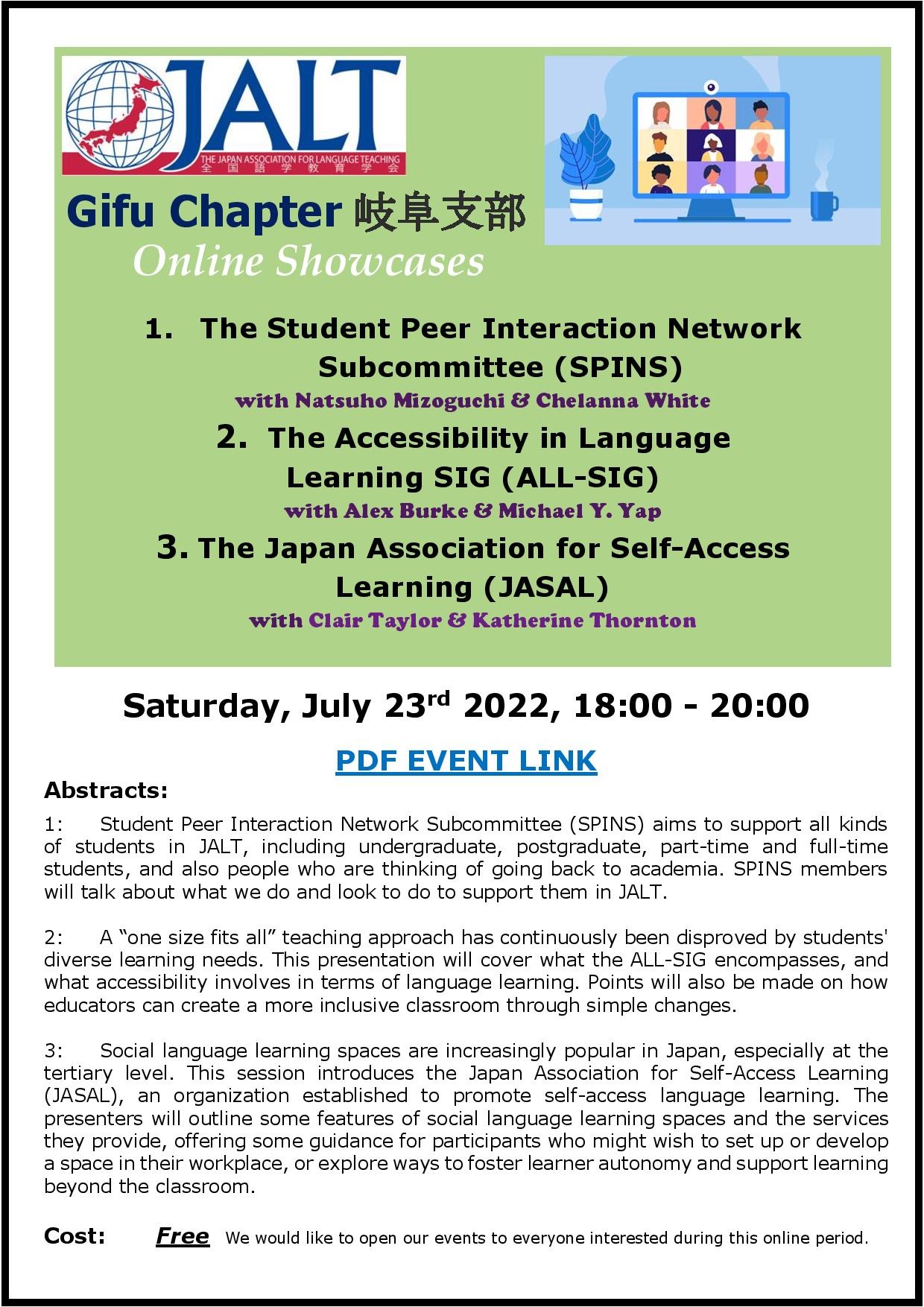 JALT Gifu has invited members of three different academic groups to showcase the activities and goals of their respective memberships.
