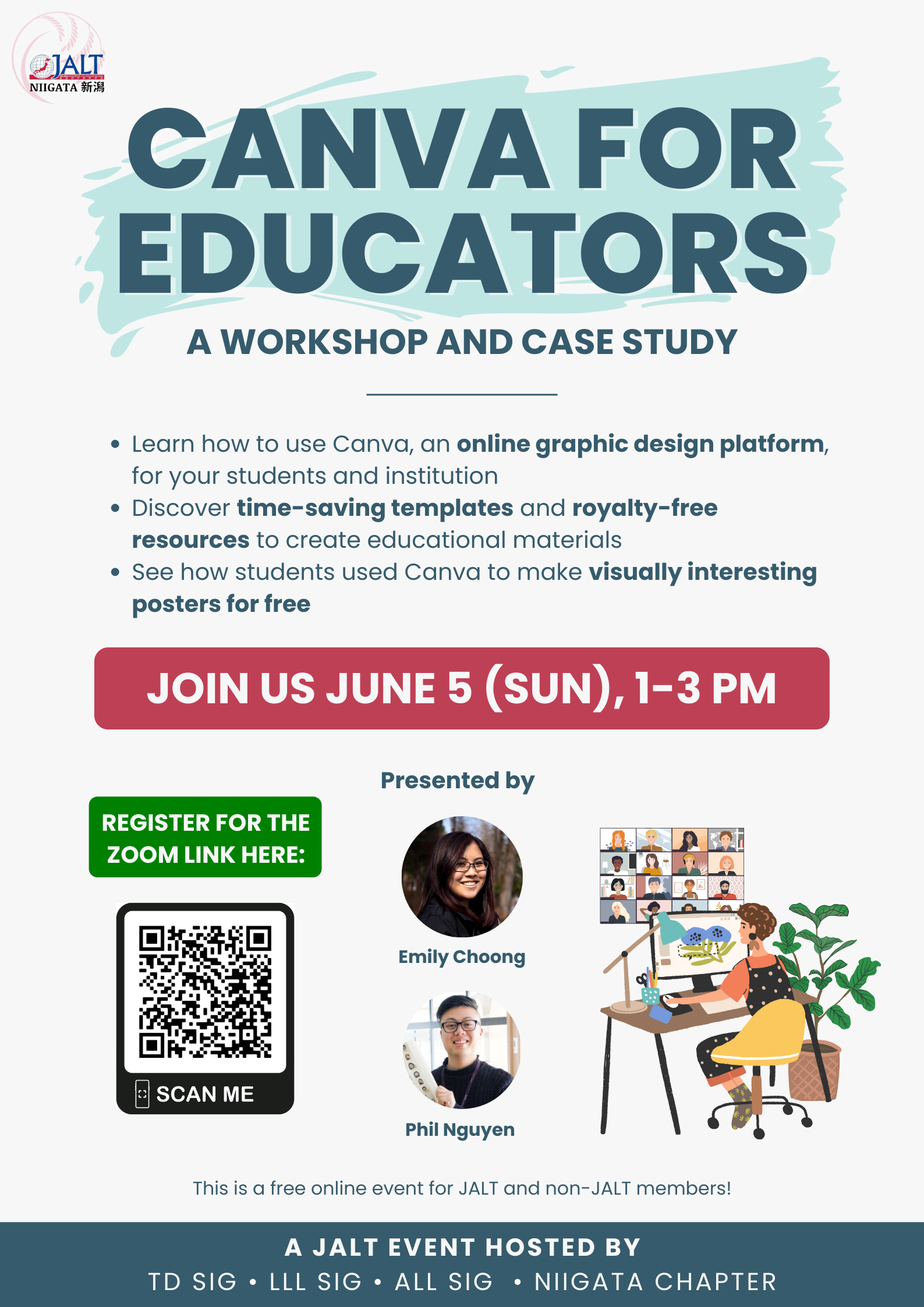 This workshop is for educators at any level who would like to explore how to use Canva, an online graphic design platform. Learn how to take advantage of Canva's user-friendly functions, library of royalty-free resources, and educational templates to create visual content. From presentations to worksheets, infographics, and video posters, join us to explore the world of Canva from an educator's perspective. In the second half we will take a look at a case study of how Canva was used in a college-level classroom. The speakers will discuss their experience of using posters for academic purposes and how they made the best use of Canva for their students. This event is co-sponsored by TD SIG, ALL SIG, LLL SIG, and Niigata Chapter.