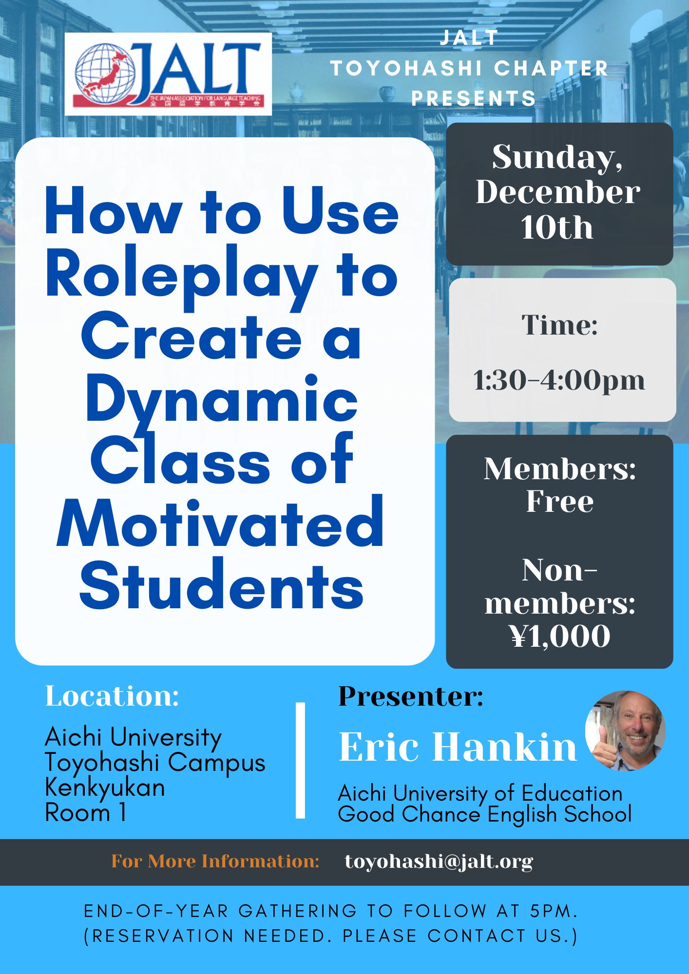 The Toyohashi Chapter's December presentation will explore and detail our long-term chapter member Eric Hankin's success using roleplay in English classes to “turbo teach” –excite and motivate– Japanese students from junior high school to adults of all ages and backgrounds. He will talk about the benefits of roleplay for students, and how teachers can create and facilitate successful improvisations in almost any setting.