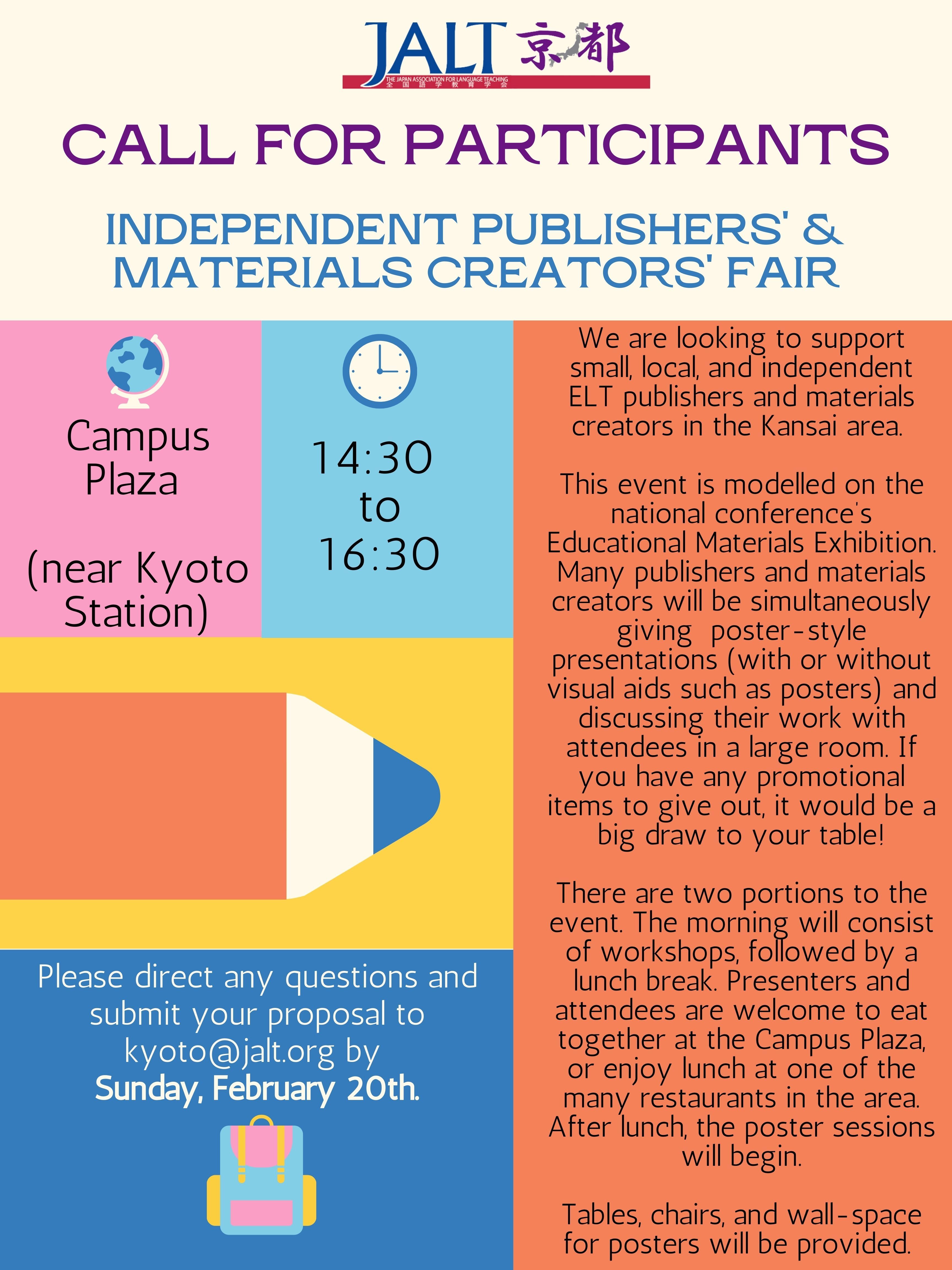 On March 13, JALT Kyoto is holding a Publishers’ Fair at Campus Plaza in Kyoto. We are looking to support small, local, and independent ELT publishers and materials creators in the Kansai area.